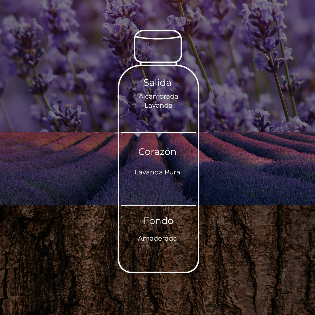La fragancia abre con la frescura medicinal del alcanfor y el carácter limpio de la lavanda, que revitalizan y relajan al mismo tiempo. Su corazón mantiene una lavanda pura y continua, como un suspiro que perdura. Finalmente, el fondo amaderado aporta estabilidad y profundidad, sosteniendo la serenidad sin perder ligereza.