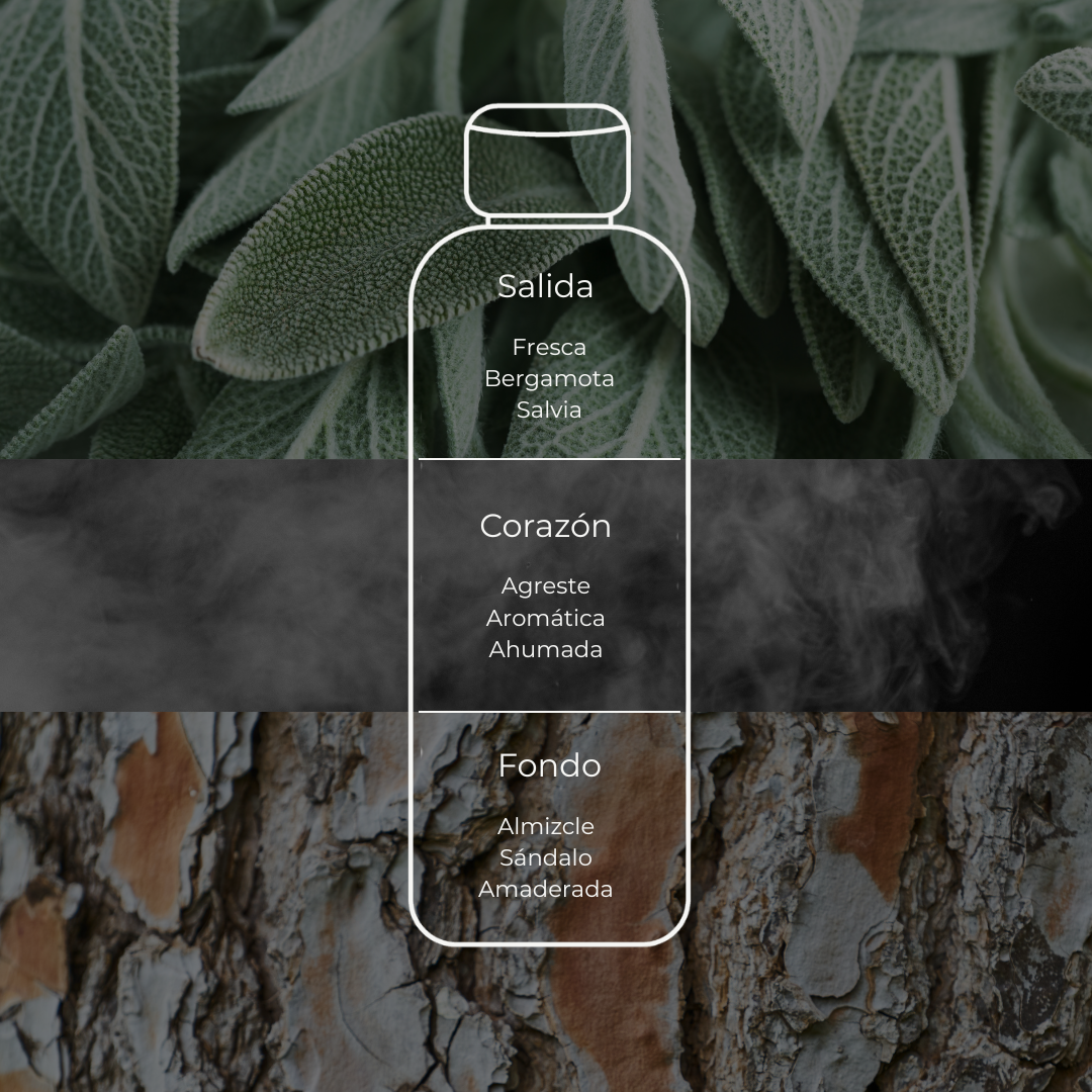 Su salida fresca de bergamota y salvia despierta con vitalidad herbal, dando paso a un corazón agreste y ligeramente ahumado, como la tierra húmeda tras el fuego. El fondo de sándalo, almizcle y maderas nobles aporta firmeza, sensualidad y una espiritualidad poderosa que permanece en el recuerdo.