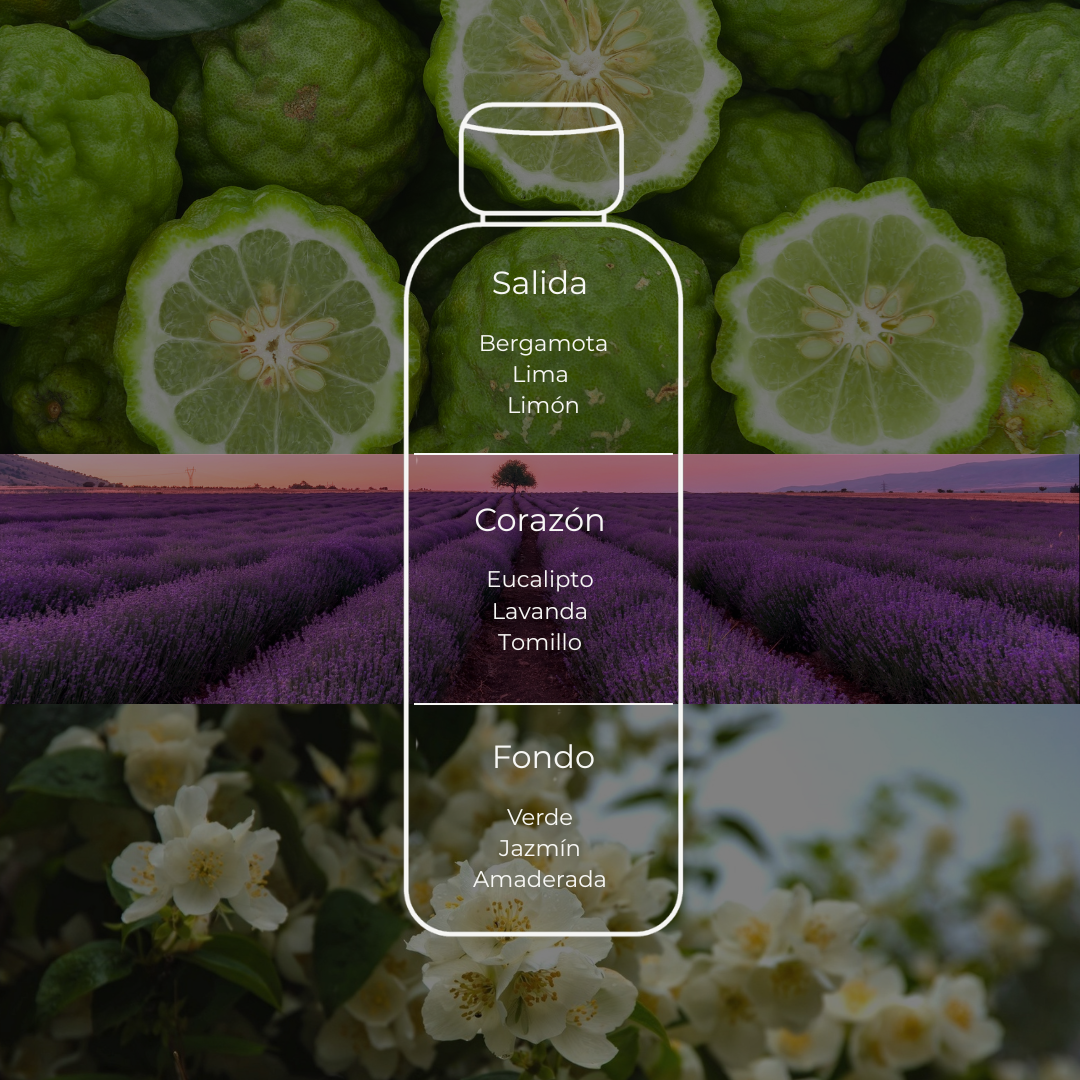 La fragancia abre con un estallido chispeante de bergamota, lima y limón, que despiertan los sentidos con vitalidad brillante. El corazón une eucalipto, tomillo y lavanda, un equilibrio herbal que transmite claridad y enfoque emocional. Finalmente, el fondo de notas verdes, jazmín y maderas suaves sostiene la frescura con armonía, dejando una estela natural y luminosa.
