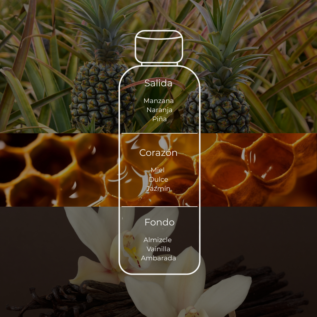 La fragancia se abre con la jugosidad fresca de manzana, naranja y piña, que despiertan alegría inmediata. En el corazón, la miel floral con jazmín aporta dulzura golosa y luminosa, mientras que el fondo de vainilla, ámbar y almizcle regala un confort profundo, dorado y envolvente.