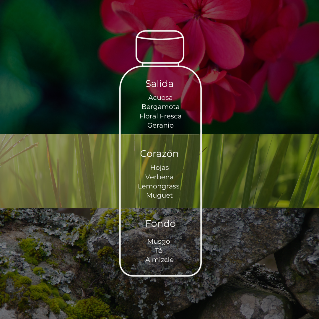 La fragancia abre con la claridad acuosa de la bergamota y notas florales frescas de geranio, que despiertan con vitalidad luminosa. Su corazón late verde y vibrante con verbena, lemongrass y muguet, evocando energía y conexión natural. Finalmente, el fondo de musgo, té y almizcle envuelve con serenidad elegante, dejando un eco inolvidable.