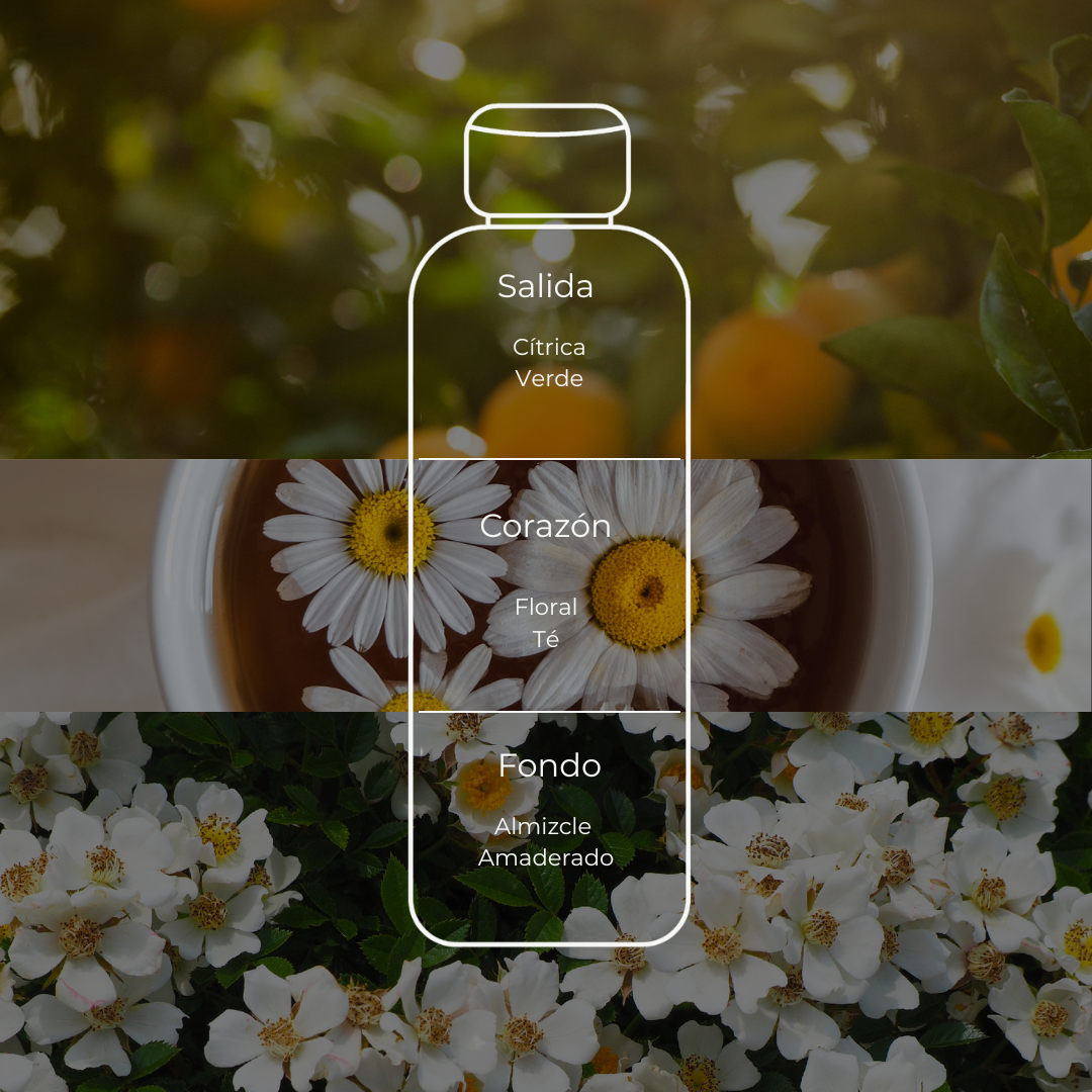 La fragancia abre con una salida cítrica y verde que refresca y limpia el ambiente. Su corazón combina un toque floral sutil con té blanco, aportando elegancia ligera, mientras que el fondo de almizcle y maderas suaves sostiene la experiencia con suavidad reconfortante.