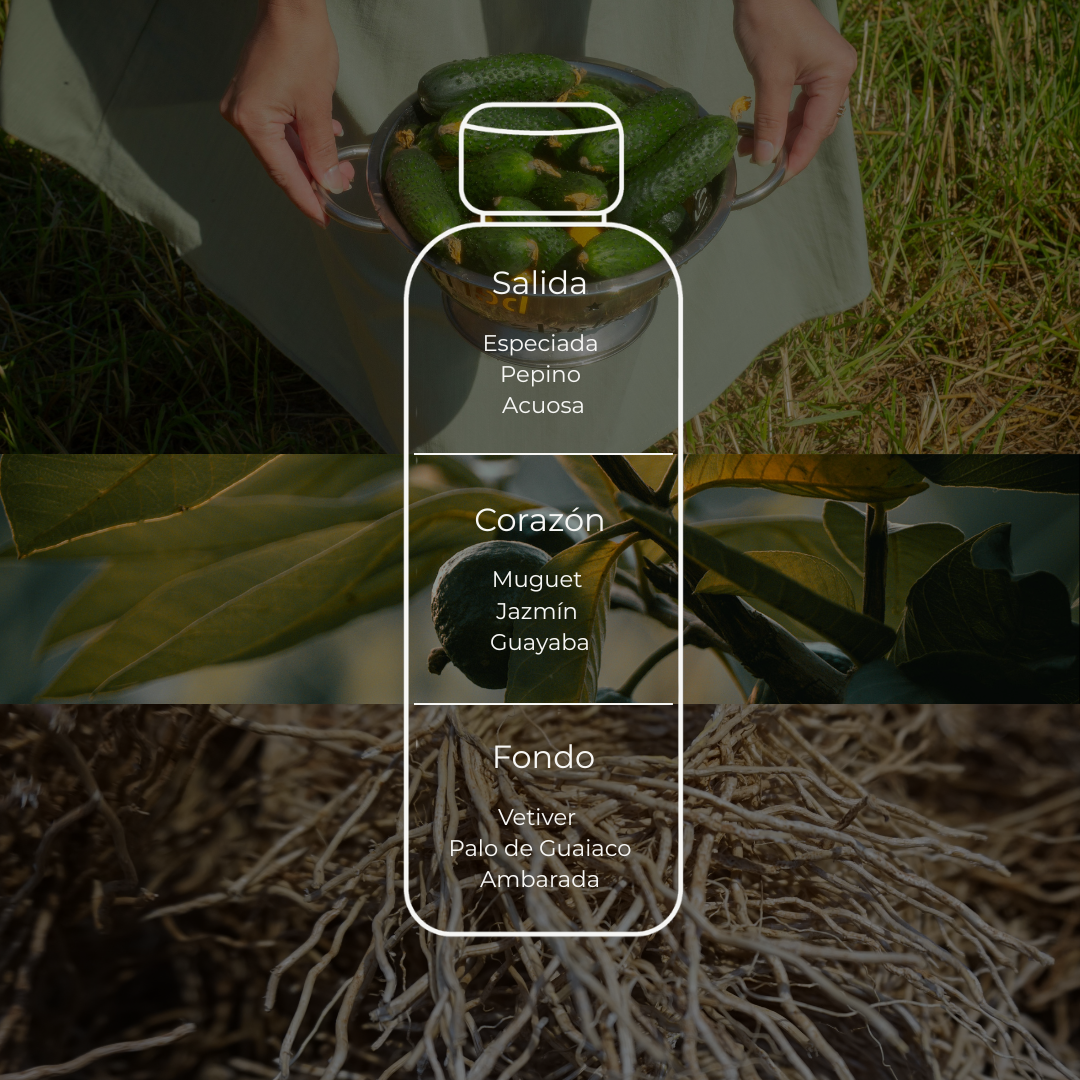 La fragancia abre con la chispa moderna del pepino fresco, especias suaves y un matiz acuoso revitalizante. Su corazón floral combina la delicadeza del muguet y el jazmín, envueltos en la dulzura tropical de la guayaba. El fondo de vetiver, palo de guayaco y ámbar aporta profundidad y sofisticación luminosa, dejando una estela elegante e inolvidable.