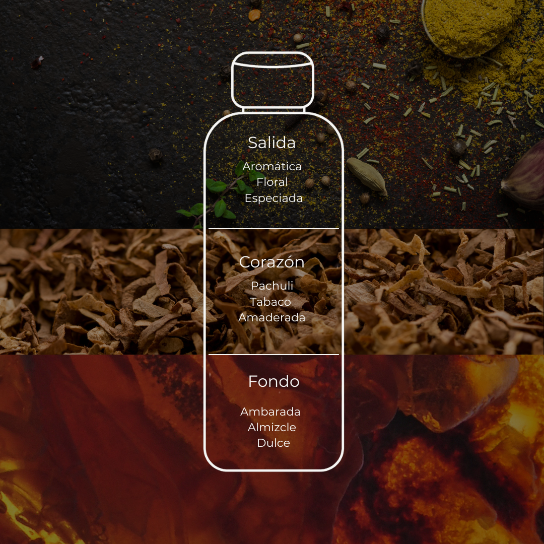 La fragancia abre con un acorde aromático, floral y especiado, que marca presencia desde el primer instante. En el corazón, el pachuli, el tabaco y las maderas crean densidad y carácter, como un susurro oscuro y terroso. Finalmente, el fondo de ámbar, almizcle y dulzura cálida redondea la experiencia con sensualidad sofisticada y persistente.