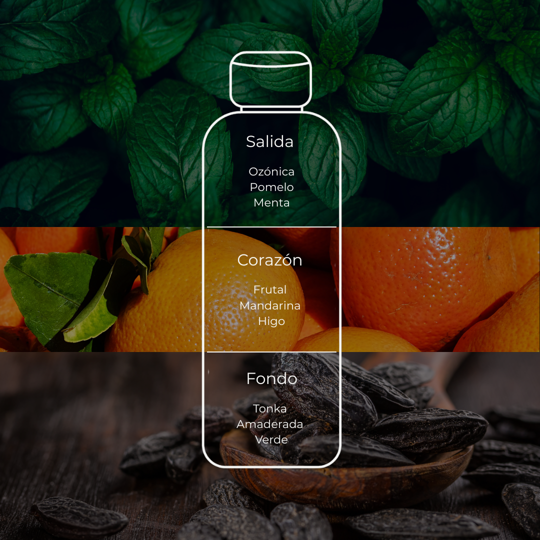 La fragancia abre con un respiro ozónico de pomelo vibrante y menta fresca, despertando los sentidos al instante. Su corazón jugoso de mandarina e higo maduro añade vitalidad despreocupada, mientras que el fondo de tonka, notas verdes y madera suave redondea la experiencia con calidez y libertad.